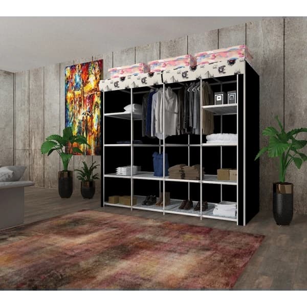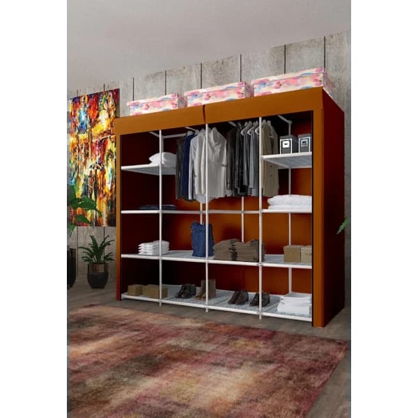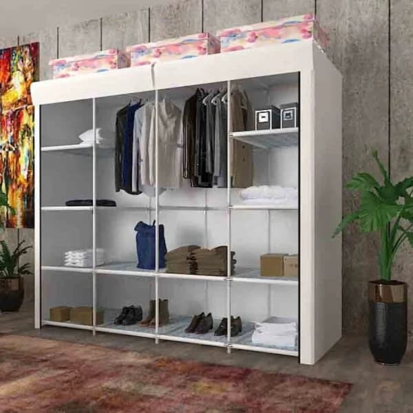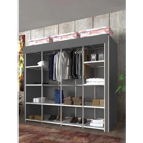 خزانة ملابس مزدوجة من القماش - نموذجنا أركتوروس؛ وهو يتألف من الأنابيب البلاستيكية وأجهزة PP. يتم إنتاج الغلاف الخارجي من الربط المسمى Spunbond. أبعاد موديل أركتوروس الذي يتكون من 12 رف قماش و 2 علاقة (40 سم) هي كما يلي: الارتفاع: 160 سم، العرض: 155 سم، العمق: 44 سم