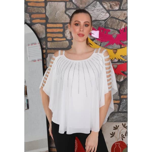 بلوزة سهرة - قطن ممشط أنيق مع نقش ليثوغراف أسود على الأكمام والياقة