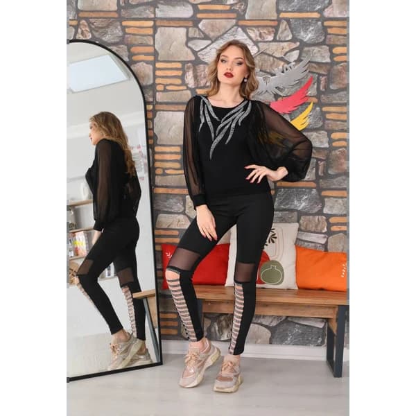 بلوزة سهرة - قطن ممشط أنيق مع نقش ليثوغراف أسود على الأكمام والياقة