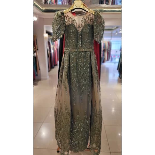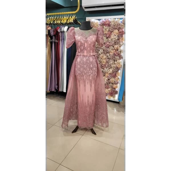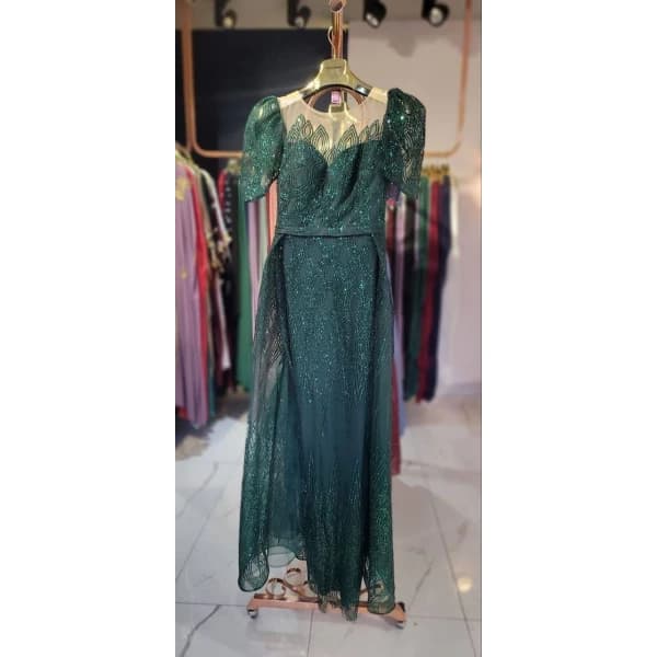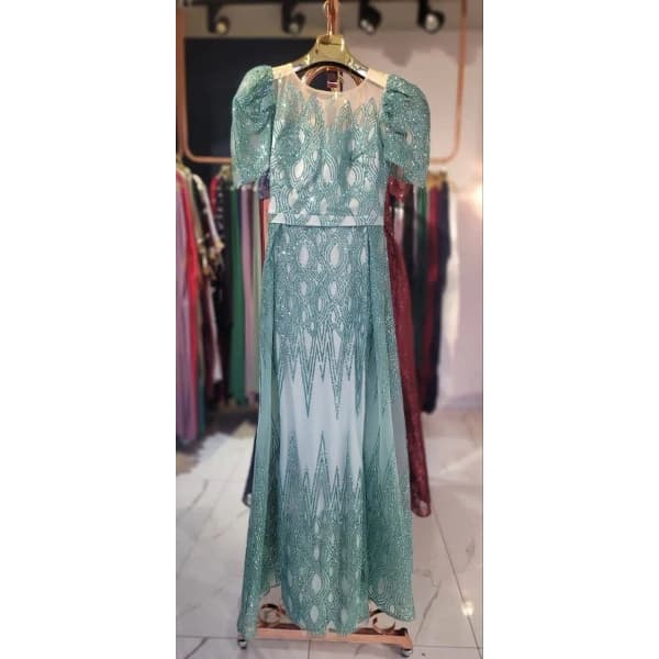 فستان سهرة - فستان سهرة طويل بأكمام قصيرة، قماش الساتان، تفاصيل كاندي وحزام خصر.