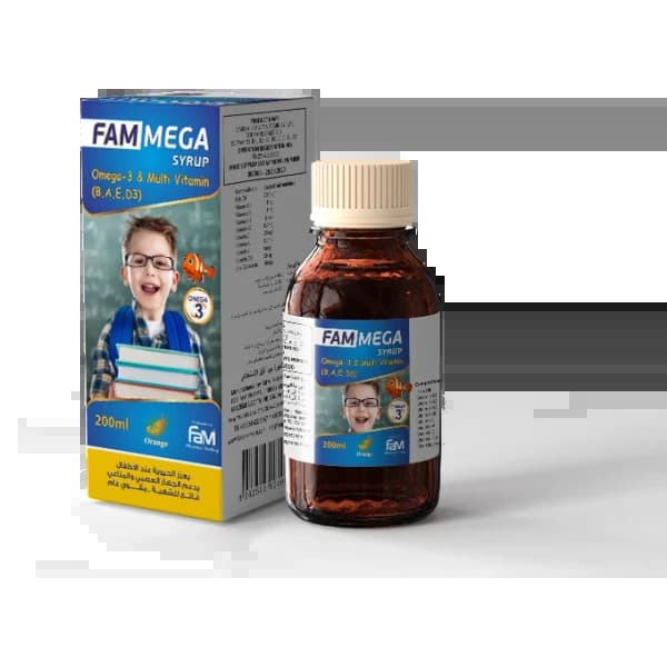 فام ميغا - يدعم شراب فام ميغا صحة الدماغ والمناعة والرؤية بسبب تركيبته الغنية التي تحتوي على زيت السمك والزنك و9 فيتامينات بنكهة البرتقال.