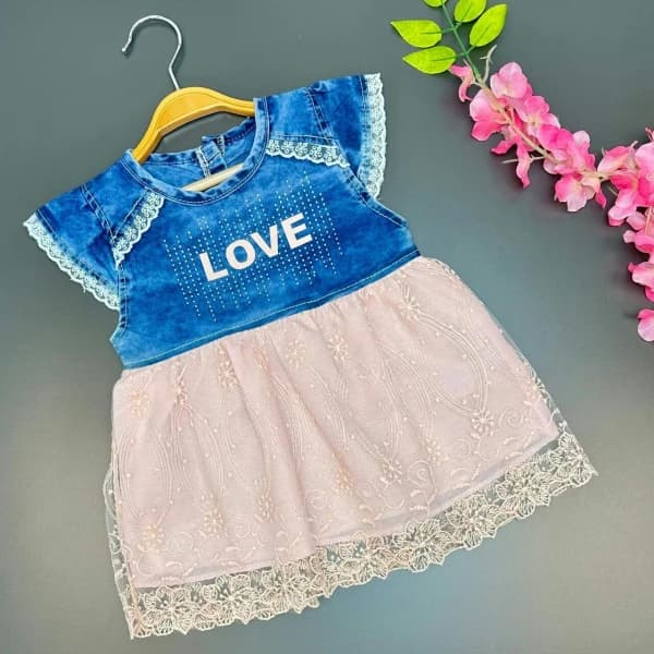 فستان بناتي علوي جينز دانتيل وردي سفلي صيفي - فستان بناتي علوي جينز دانتيل وردي سفلي صيفي