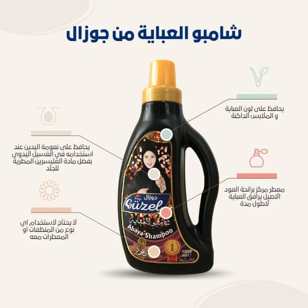 سائل تنظيف العباية و الملابس السوداء بعطر العود يحتوي مواد فعالة عالية الجودة يحتوي على مادة الغليسرين المطرية للملابسة و ناعمة على الأيدي مناسب للغسيل اليدوي