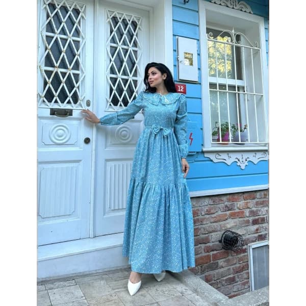 فستان أزرق مع ذوي الياقات البيضاء - فستان من القماش القطني
