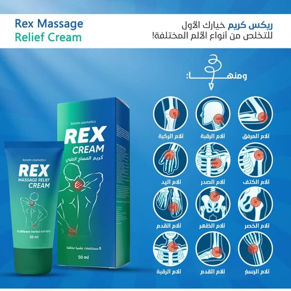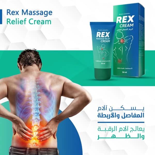كريم المساج الطبي - ركس - الحل الفعال لآلام المفاصل والفقرات وتشنج العضلات وذلك بفضل احتوائه على ثماني خلاصات نباتية فعالة في علاج مشكلة آلام المفاصل وخاصة المزمنة منها