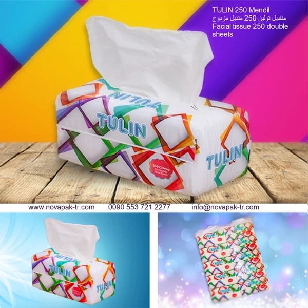 مناديل تولين 250 - مناديل تولين طبقتين , جودة عالية , الكمية 250 داخل كيس نايلون مطبوع , الباكيت = 10 حبات , مقاس المنديل 20*20سم