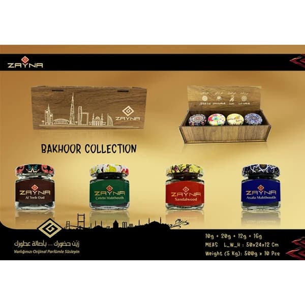 تقدم شركة زينة مجموعة البخور المتكونة من أربعة أنواع مع علبتها التاريخية.